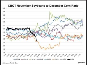 Chicago-traded November soybeans on Thursday topped $14 per bushel for the first time in eight years, having surged 27% since the start of 2021. That is the best performance for the contract during that period in nearly 50 years, but it has still staged historic losses relative to corn. The year did not start that way. November soybeans were highly elevated versus December corn through March, very much favoring the oilseed, similar to both 2017 and 2018. But the new-crop soybean-corn ratio over the last month has plunged 11% to 2.24 as of Thursday, levels that have not been seen since 2019, and that is despite hefty gains in soybeans. Such a sharp fall in that ratio from early April to early May has not been observed for at least a quarter century.