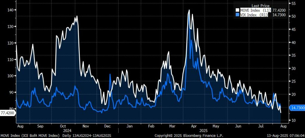 Yesterday’s US CPI has been construed as confirming the likelihood of a Fed rate cut in September, and yet core CPI was slightly above expectations 0.3% m/m and a very lofty 3.1% y/y (relative to target). While good price inflation remained relatively subdued, which some will interpret as signalling a modest impact from tariffs, it remains the case that the impact of tariffs, which has been persistently delayed, will only start to meaningfully show up in coming months. Rather more worryingly, especially for the likes of the dissenting Waller (Bowman’s case appears to rest far more on the labour data – i.e. the data for which the head of the BLS was ‘fired’) is the upturn in Services CPI (0.3% m/m 3.8% y/y), above all ex-Housing at 0.5% m/m. To be sure Airfares (4.0% m/m) had a sharp impact, but as the attached chart highlights, the seasonal trend is running a good deal higher than in 2024, and it would be disingenuous to suggest that it is consistent with core CPI converging to the Fed’s 2.0% target. Be that as it may, risk assets, above all equities, celebrated this with a move to new highs in many cases. The latter is being given extra rocket fuel by speculation about a potential 50 bps rate cut in September, presumably partially rationalised by Miran’s temporary appointment to the FOMC. The case against 50 bps primarily boils down to last year’s 50 bps cut having been a mistake, above all due to FOMC members over-interpreting the transient weakness in labour demand last summer (sic! Ed.), which one might add probably contributed to the extended pause in rate cuts this year. Be that as it may, the other key drivers of the current rally, aside from Q2 earnings (above all Mag 7) is very subdued interest rate volatility. As can be seen both in the chart of the narrow range in which the Dec 2025 SOFR future has traded over recent months, and over the year to date as a whole compared to the 2024 rate expectations roller coaster, and the very low level of the MOVE Treasury volatility index, which is in turn helping to keep the VIX subdued. Of course what is missing from this rationale is any discussion of tariffs, geopolitical tensions, uncertainty, policy ambiguity, or political interference in monetary policy, which fits with markets whose reaction function has been severely impaired (above all by QE liquidity, which has not risen this year despite QT programmes), and is largely reliant on momentum trades, with the derivatives tail very much ‘wagging the dog’. This is a classic example of a perception vs. reality divide that has a tendency to unravel in a disorderly fashion, though the degree generally varies according to happenstance, the worst example being the GFC.