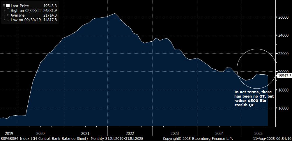 Yesterday’s US CPI has been construed as confirming the likelihood of a Fed rate cut in September, and yet core CPI was slightly above expectations 0.3% m/m and a very lofty 3.1% y/y (relative to target). While good price inflation remained relatively subdued, which some will interpret as signalling a modest impact from tariffs, it remains the case that the impact of tariffs, which has been persistently delayed, will only start to meaningfully show up in coming months. Rather more worryingly, especially for the likes of the dissenting Waller (Bowman’s case appears to rest far more on the labour data – i.e. the data for which the head of the BLS was ‘fired’) is the upturn in Services CPI (0.3% m/m 3.8% y/y), above all ex-Housing at 0.5% m/m. To be sure Airfares (4.0% m/m) had a sharp impact, but as the attached chart highlights, the seasonal trend is running a good deal higher than in 2024, and it would be disingenuous to suggest that it is consistent with core CPI converging to the Fed’s 2.0% target. Be that as it may, risk assets, above all equities, celebrated this with a move to new highs in many cases. The latter is being given extra rocket fuel by speculation about a potential 50 bps rate cut in September, presumably partially rationalised by Miran’s temporary appointment to the FOMC. The case against 50 bps primarily boils down to last year’s 50 bps cut having been a mistake, above all due to FOMC members over-interpreting the transient weakness in labour demand last summer (sic! Ed.), which one might add probably contributed to the extended pause in rate cuts this year. Be that as it may, the other key drivers of the current rally, aside from Q2 earnings (above all Mag 7) is very subdued interest rate volatility. As can be seen both in the chart of the narrow range in which the Dec 2025 SOFR future has traded over recent months, and over the year to date as a whole compared to the 2024 rate expectations roller coaster, and the very low level of the MOVE Treasury volatility index, which is in turn helping to keep the VIX subdued. Of course what is missing from this rationale is any discussion of tariffs, geopolitical tensions, uncertainty, policy ambiguity, or political interference in monetary policy, which fits with markets whose reaction function has been severely impaired (above all by QE liquidity, which has not risen this year despite QT programmes), and is largely reliant on momentum trades, with the derivatives tail very much ‘wagging the dog’. This is a classic example of a perception vs. reality divide that has a tendency to unravel in a disorderly fashion, though the degree generally varies according to happenstance, the worst example being the GFC.