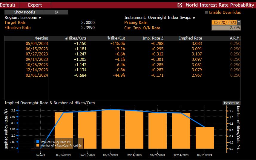 Be that as it may, in the commodity space the FT Commodities Global Summit gets underway, the EU publishes its monthly MARS Crop Bulletin, and the UN Intergovernmental Panel on Climate Change is due to publish its latest ‘synthesis report’. Markets will debate whether the central bank Swap liquidity moves make rate hikes at this week’s policy meetings less likely, and have indeed moved to price rate hikes at this week’s meetings as no more than a risk – see attached charts. As noted in the week ahead, the question is whether primary credit markets gradually re-open, with issuers essentially needing to weigh up whether the sharp fall in underlying govt bond yields effectively offsets the widening in credit spreads.